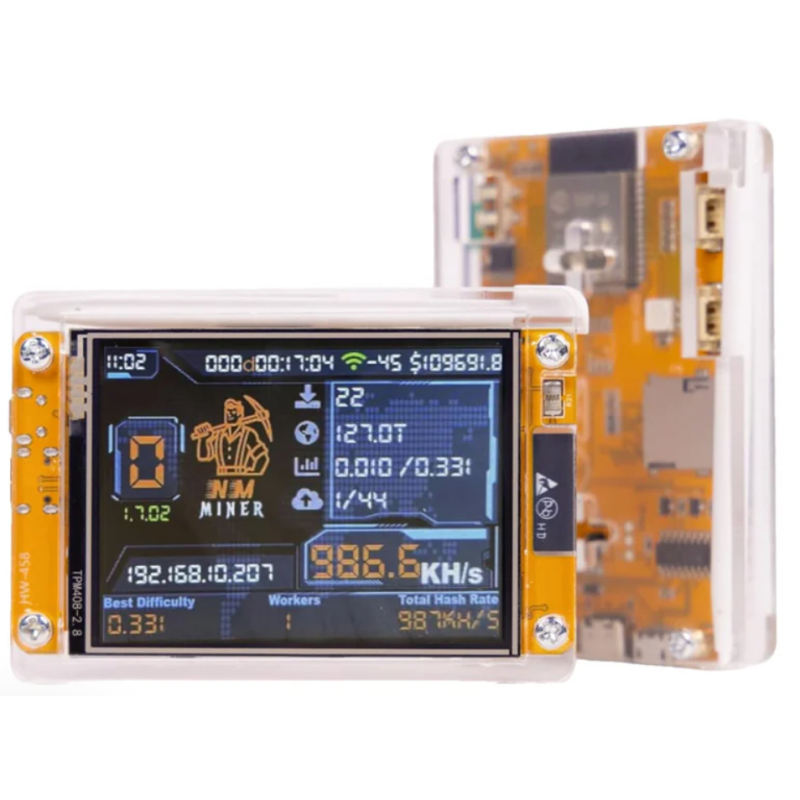 Built around an ESP32-S3 microcontroller, the NerdMiner V2 delivers approximately ~1 MH/s (1000 KH/s) while consuming minimal power, making it ideal for 24/7 operation with negligible electricity usage.